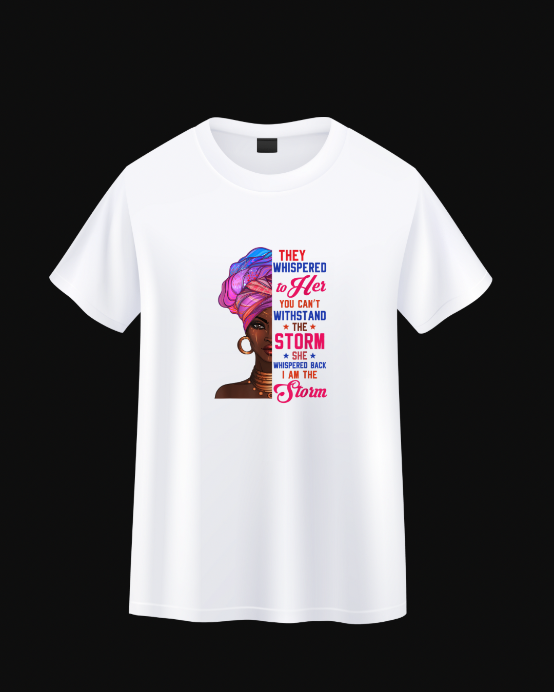 Bold and empowering, this “I Am the Storm” t-shirt features a striking illustration of a strong Black woman with a colorful headwrap, making it the perfect statement piece. A must-have for those who embrace their power and resilience.