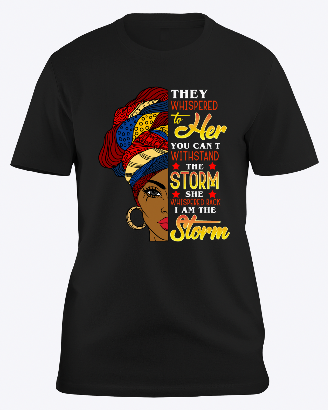 Description: This powerful tee declares strength and resilience with the quote: “They whispered to her, you can’t withstand the storm. She whispered back, I am the storm.” Featuring a beautiful Black woman with a vibrant headwrap, this shirt is made for those who overcome every obstacle.